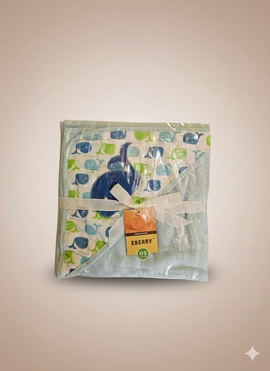 Manta para bebé con capucha, diseño de ballena bordada y estampado de ballenitas en tonos azul y verde. Suave, cómoda y perfecta para después del baño o para mantener al bebé abrigado. Presentación en bolsa transparente con cinta decorativa.